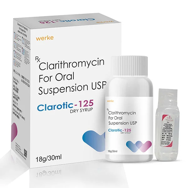 CLAROTIC 125 is an orange-flavored clarithromycin suspension (125mg/5ml) for child infections. Treats throat, ear, and respiratory infections.