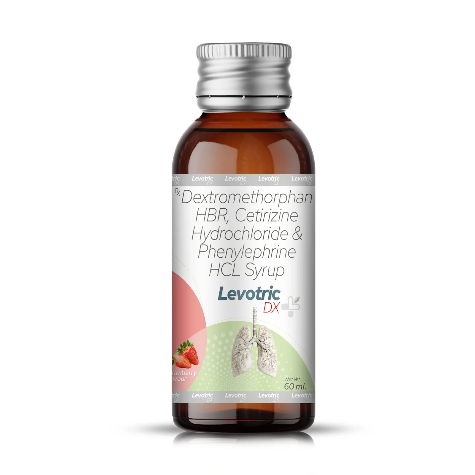 LEVOTRIC-DX syrup combines Dextromethorphan 10mg, Cetirizine 5mg & Phenylephrine 5mg per 5ml for effective cough and cold relief. 100ml bottle.